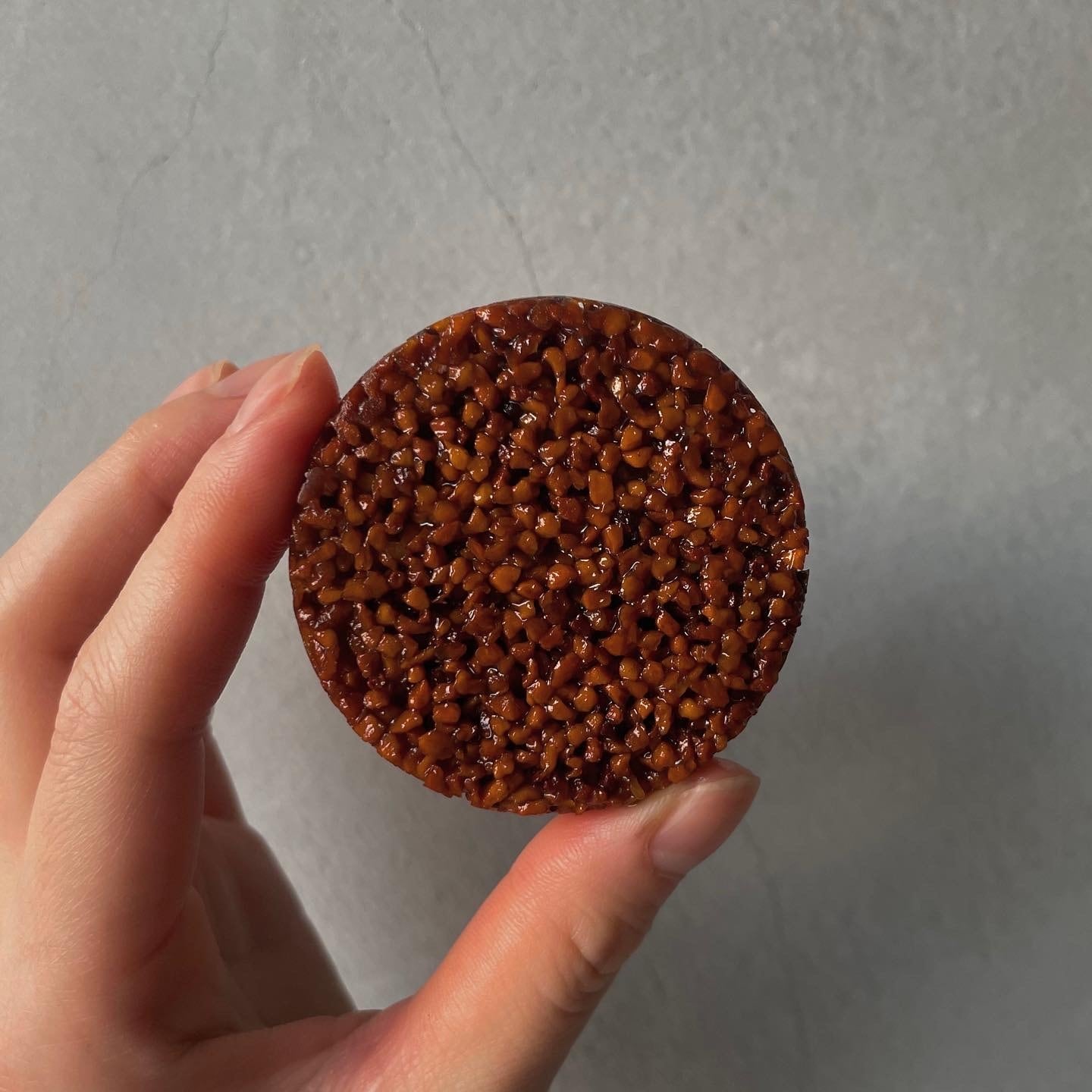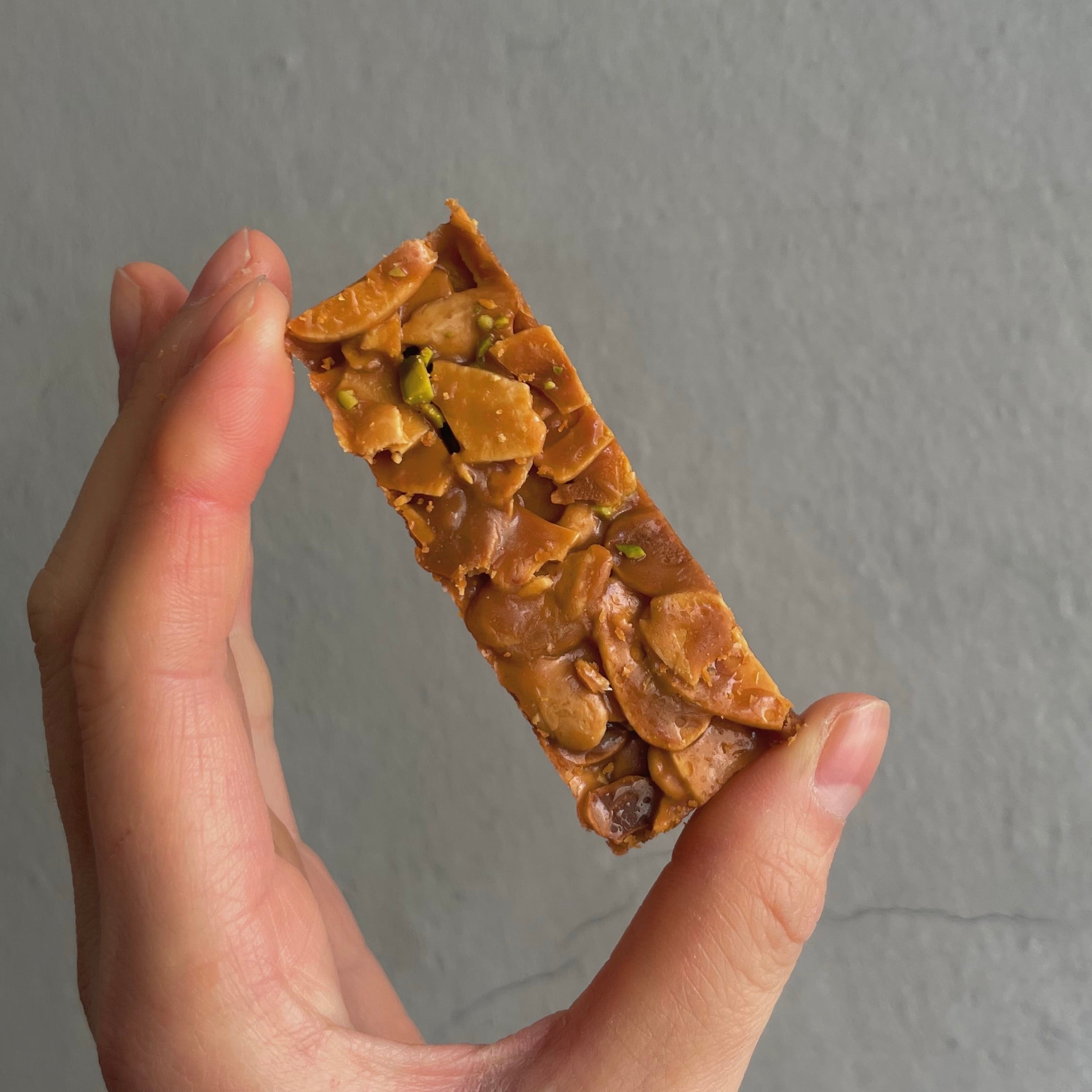 フロランタン…少し厚めのクッキー生地に、パリパリのアーモンドスライス、キャラメル、ピスタチオをたっぷりとのせたお菓子です。キャラメルのねっちりとした食感ではなくぱりっと歯ごたえの良い食感に仕上げております。